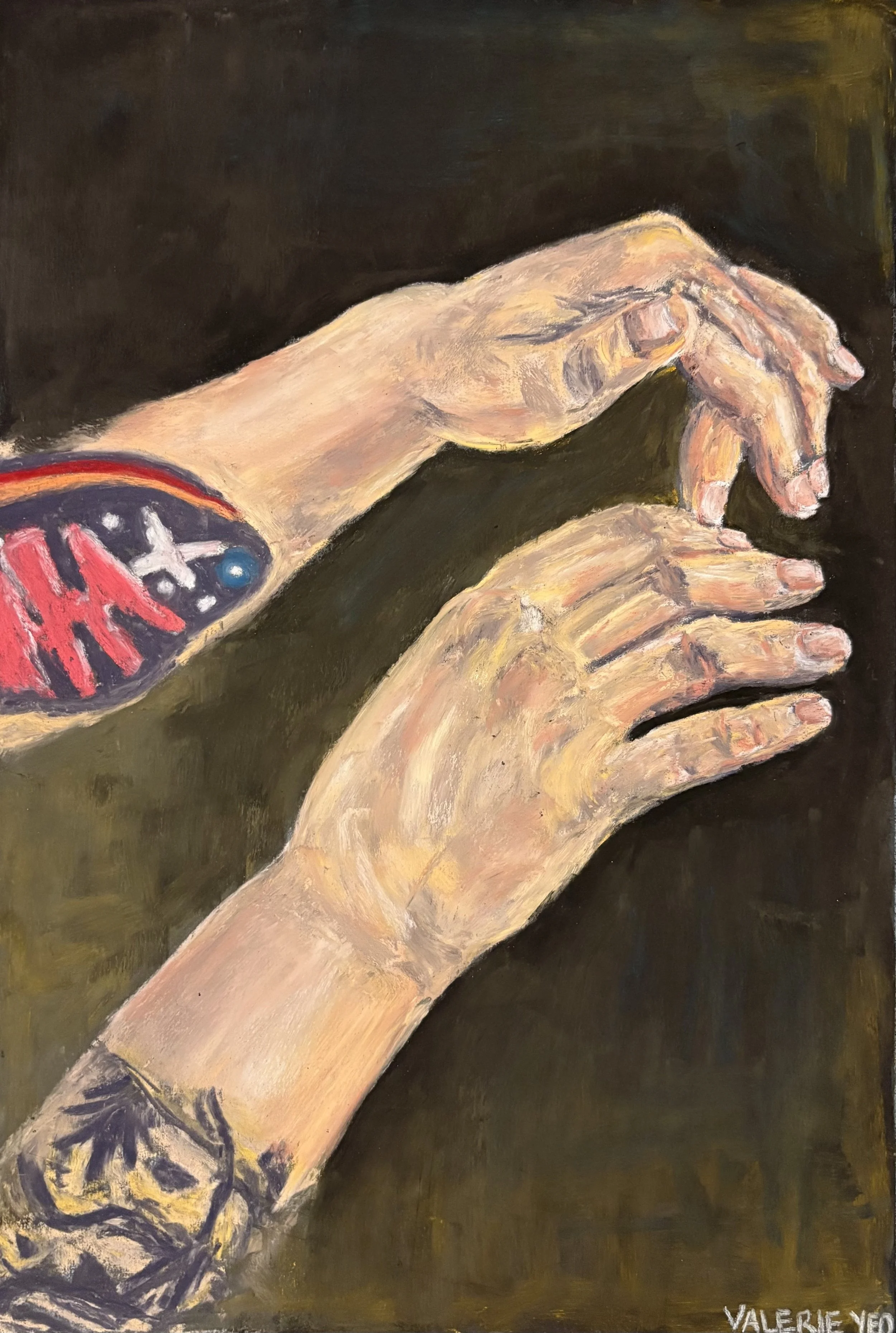 I love the idea of ephemerality, and the beauty of a moment that does not last forever. Much of my recent work draws on themes of diaspora, found family, ancestors, and energy—all elements that are ever changing in nature. I was born in Singapore, a country not yet 100 years old, and I’ve lived many lives since. Sometimes the ghosts of these past lives manifest in different ways, their forms changing with the shifting of each season. Each pair of hands is painted in soft pastel, itself a fragile and ephemeral medium. The hands themselves are also transitory, and they are captured in this series as a moment in time. They will continue to change outside of these snapshots, learning new ways of being, finding paths forward and places of stillness in the midst of life’s chaos.